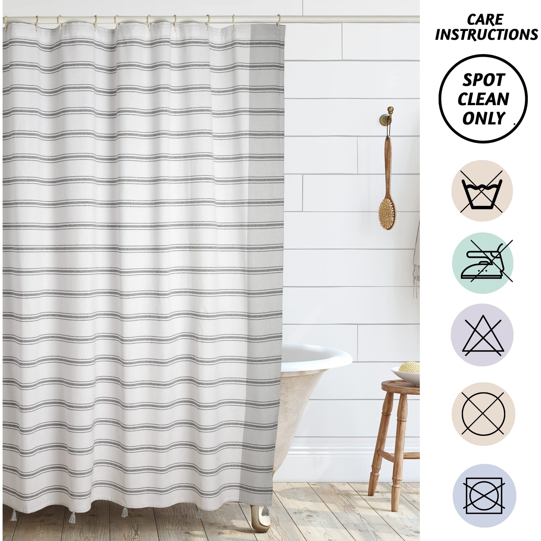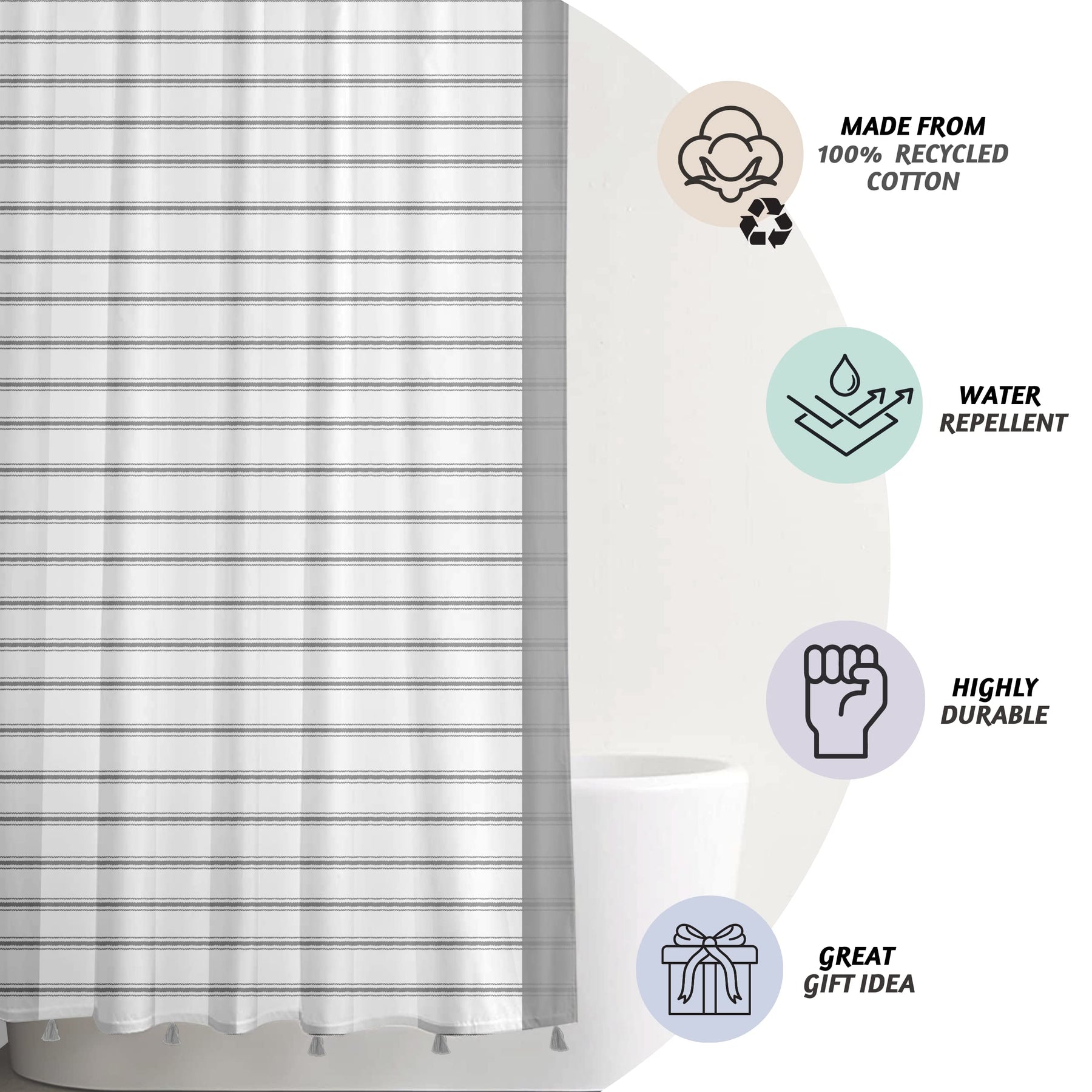 Introducing a completely new set of bath accessories to elevate your bathroom design. Featuring advanced water-repellent technology, these cotton shower curtains are crafted with a water-resistant finish that actively repels water, allowing it to slide off without absorption. The cotton shower curtain or white fabric shower curtain does not require a liner, making it both functional and stylish. The grey shower curtain comes in a standard square size of 72" x 72", large enough to cover your bathing area in the most elegant way. This shower curtain is machine washable and should be laid flat to dry. Designed for long-lasting durability, these white shower curtains remain soft and beautiful even after many washes. Available in ten cool tones, they are sure to enhance the look of any bathroom. Made from 100% recycled cotton, this eco-friendly shower curtain is our way of giving back to the environment. Each curtain comes with basic loops that fit standard hooks or rings, ensuring easy installation. The modern farmhouse shower curtain or white boho shower curtain is simple to use and adds a touch of charm and sophistication to any bathroom decor.